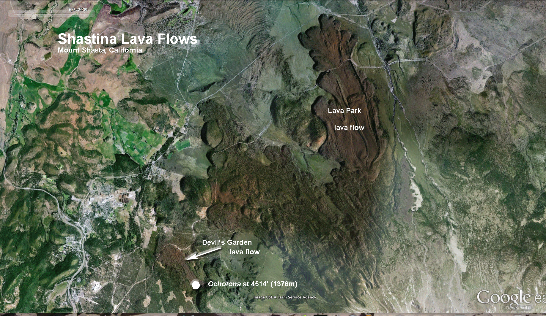 Earth photo of the Shastina lava flows, context of Devils